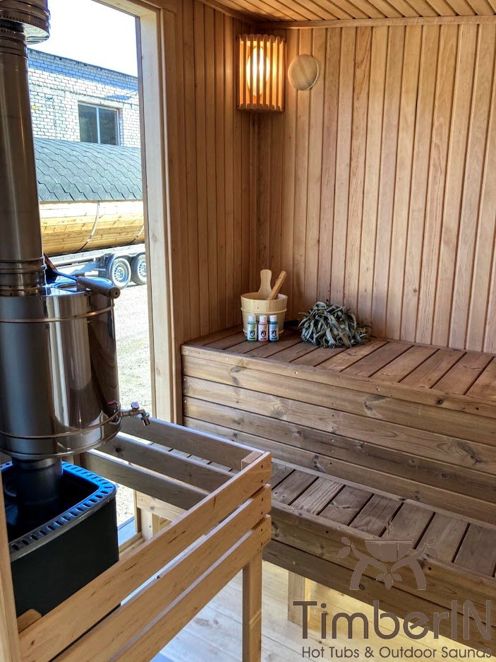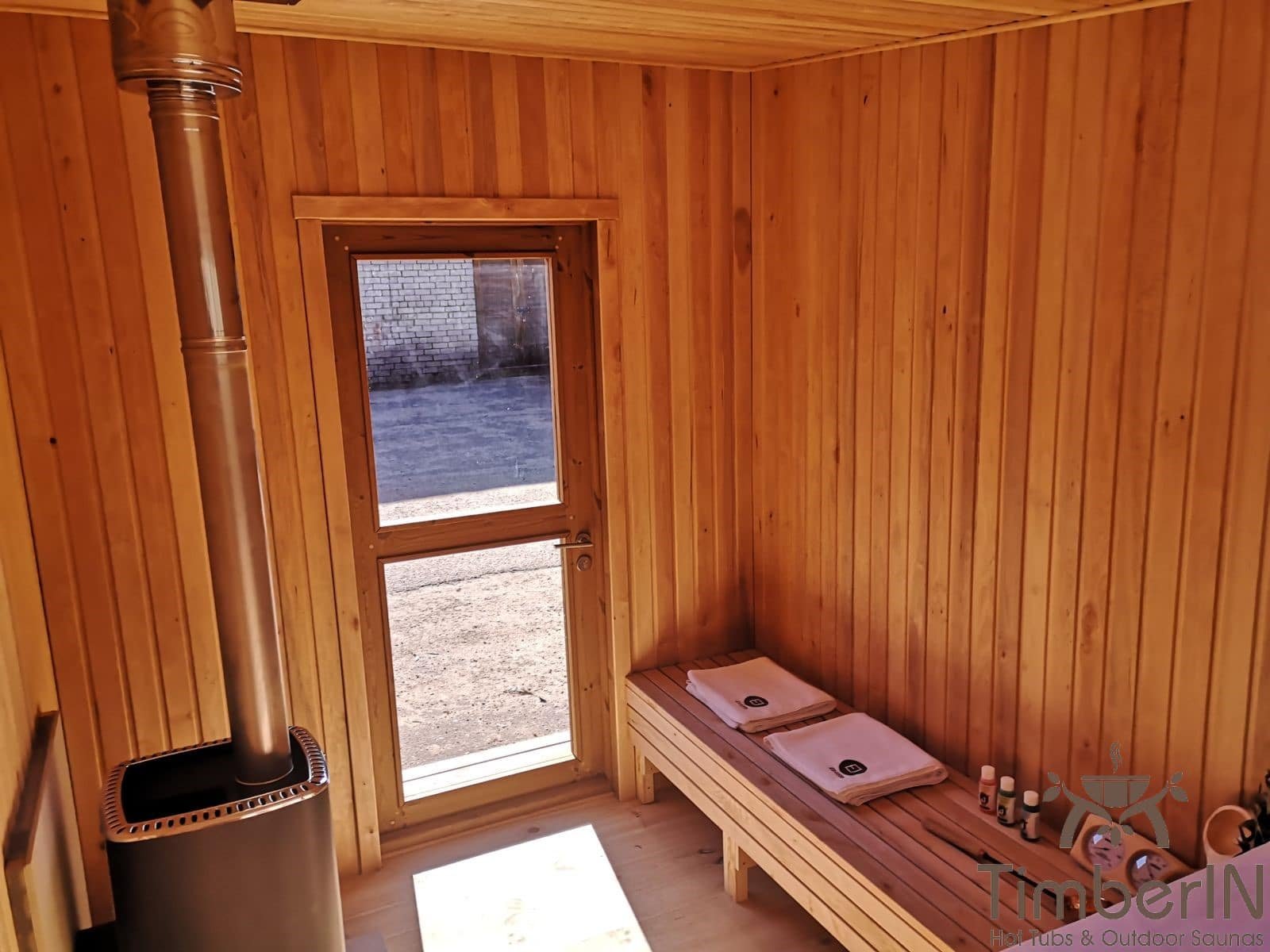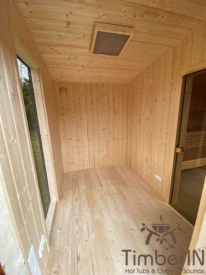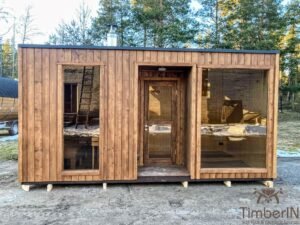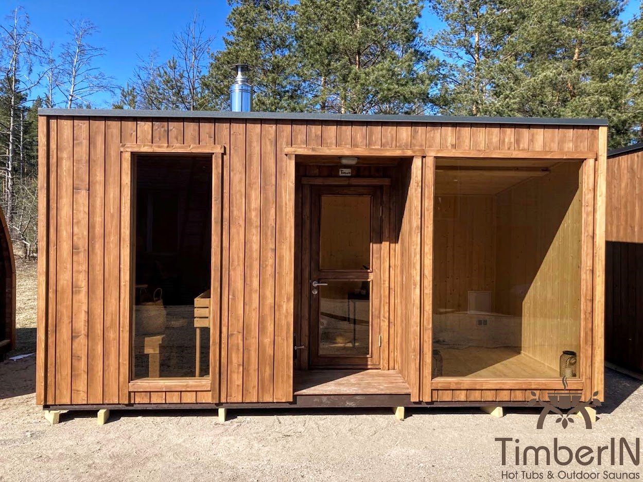 Il est également important de noter la compartimentation. Le produit dispose d’une cabine pour s’habiller et d’une cabine sauna séparé. De cette façon, vous pouvez profiter de votre temps et de l’ensemble du processus, tout en apportant une gamme d’expériences cool et amusante dans le mélange. Nous souhaitons tous essayer quelque chose de nouveau et de différent, et le sauna moderne de jardin doté d’une façade en verre répond parfaitement à cette attente.