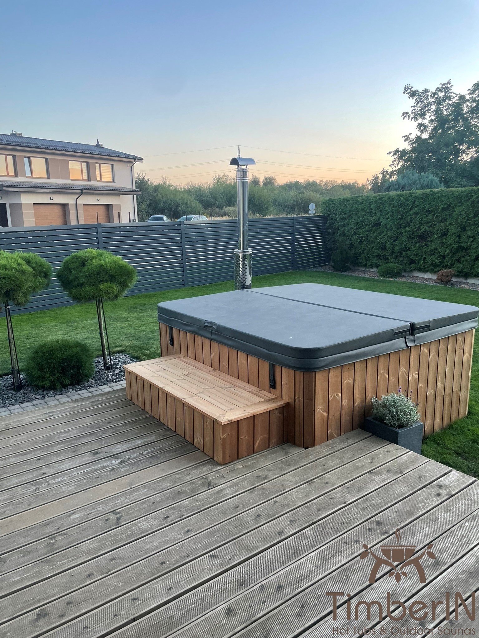 Entrez dans votre paradis personnel avec facilité et élégance grâce aux larges marches en bois. Ces marches robustes et confortables offrent un accès sûr et pratique au bain nordique, améliorant votre expérience de baignade.