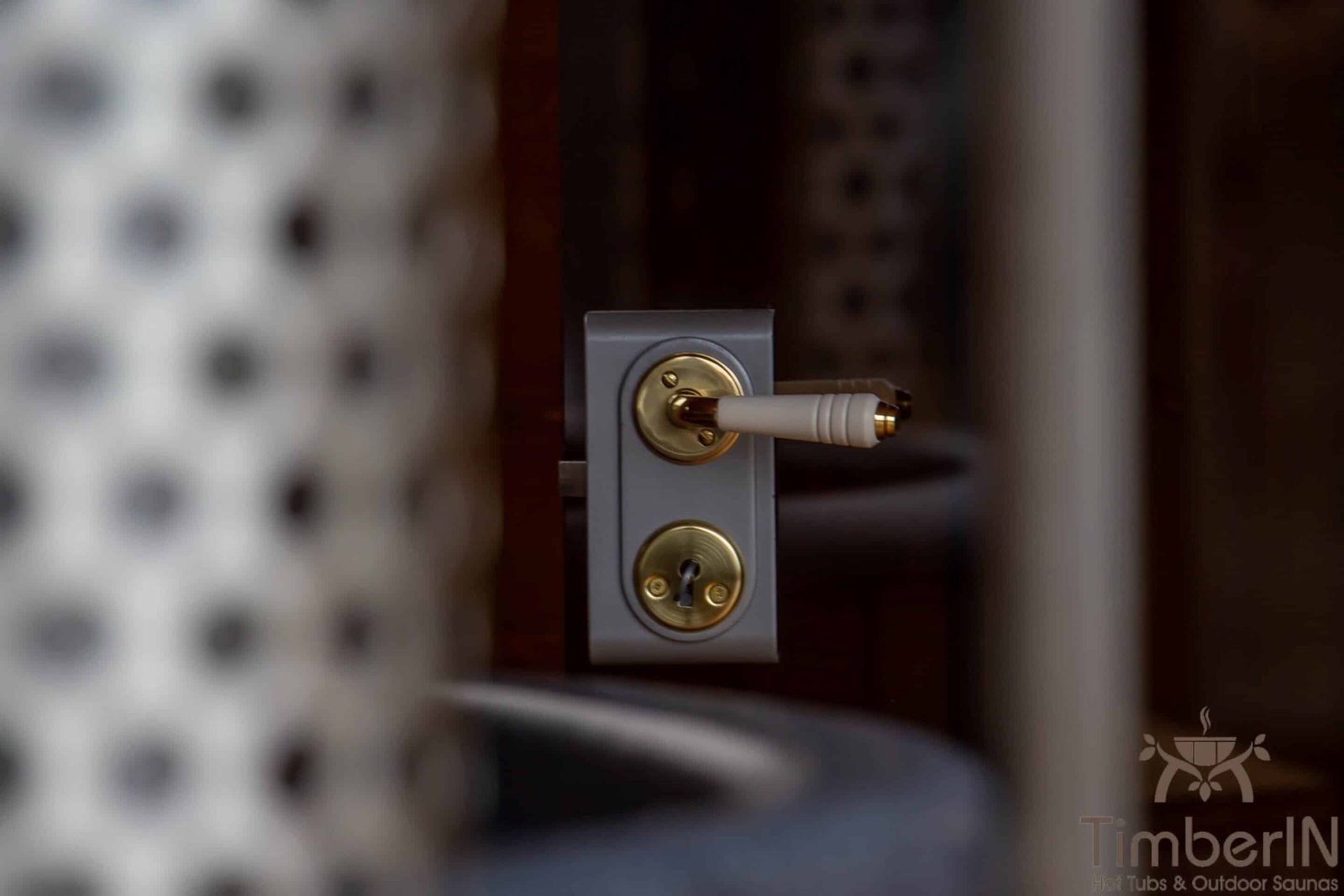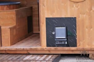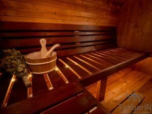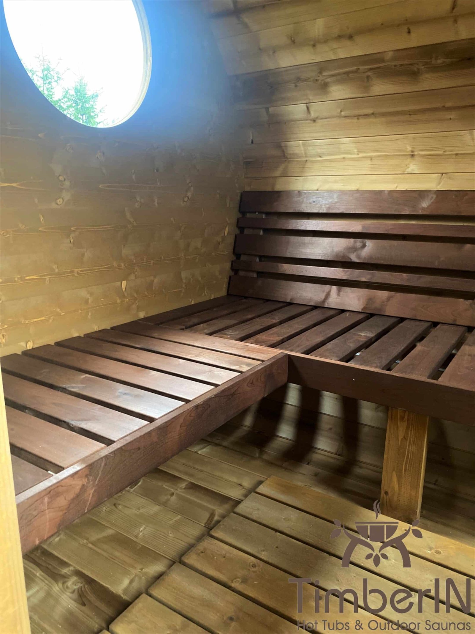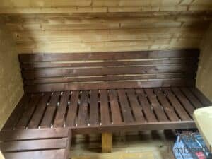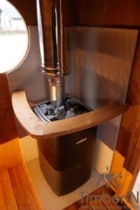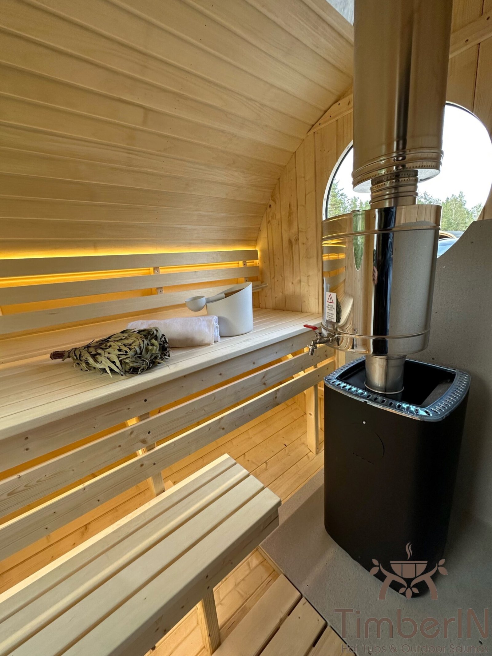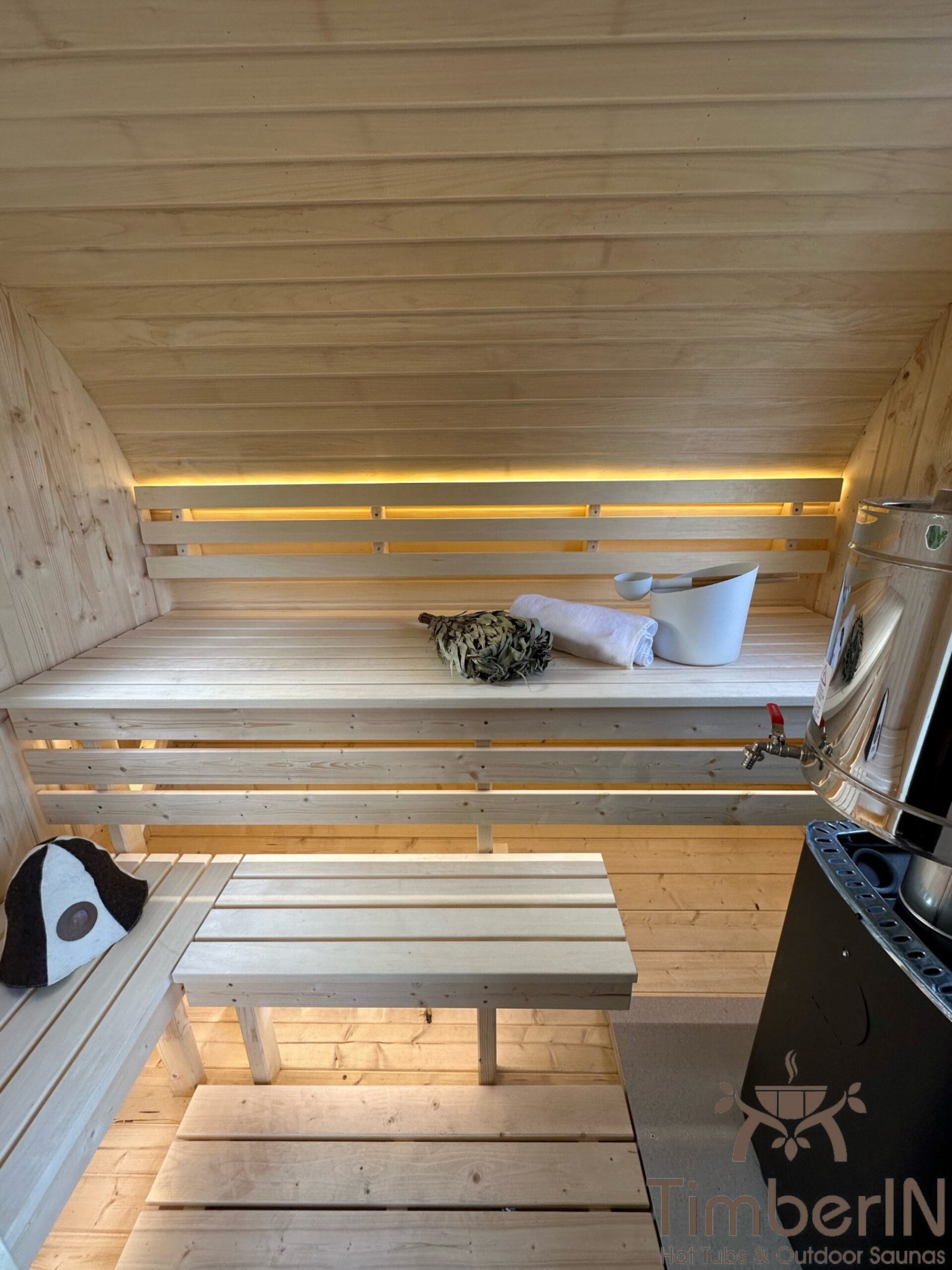 Sur le côté droit, vous avez le sauna extérieur bien conçu avec un poêle à bois ou électrique intégré.